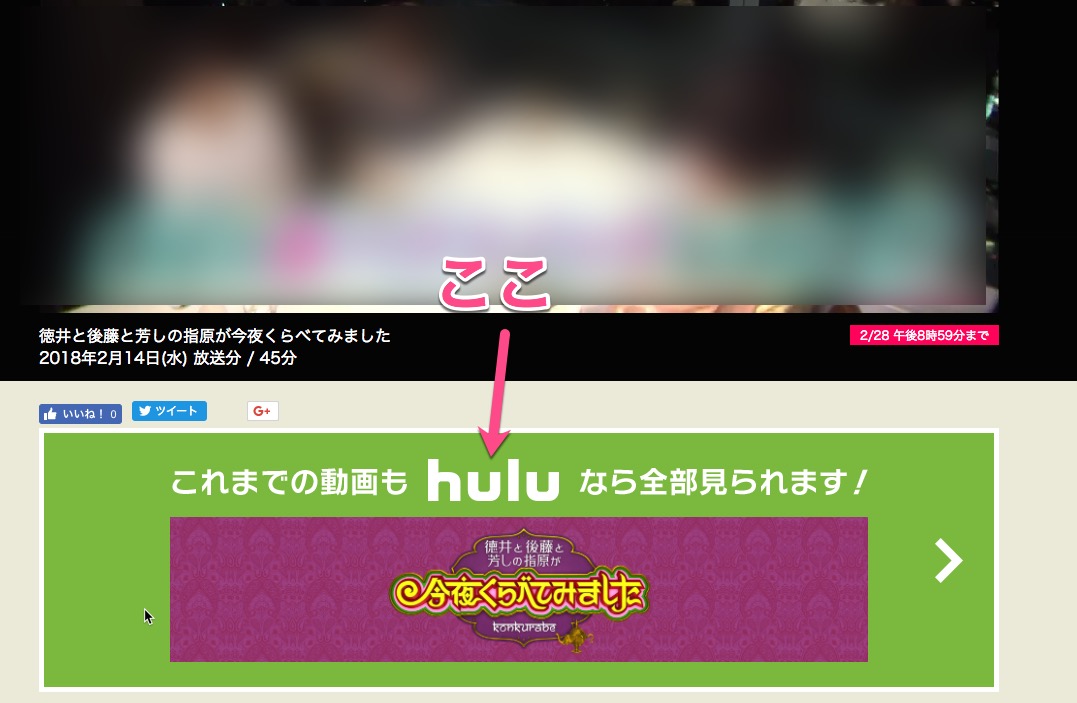 日テレ無料TADAでは見逃し再生に特化したサイトとなっているので、最新話のみ視聴できます。それまでの動画がみられる番組には、下図のようにHuluで視聴可能ということがお知らせされていて使いやすいです。
