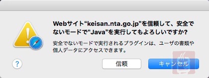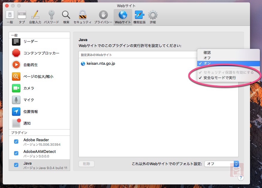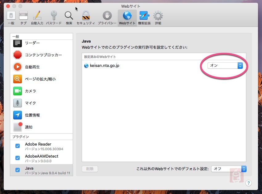 右側のJavaの「Webサイトでのこのプラグインの実行許可を設定してください」のリスト上にある「keisan.nta.go.jp」の設定は、この時点では「オン」になっているはずです。