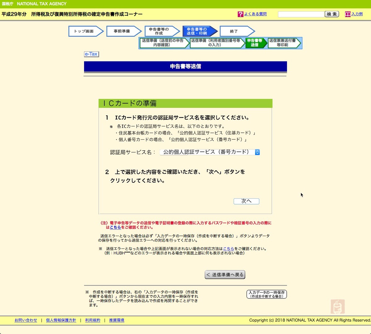 そのため申告書の送信の部分からは、妻のWindowsパソコンを借りてやってました。マイナンバーに切り替えたので状況が少しは変わるかもと期待したのですが…