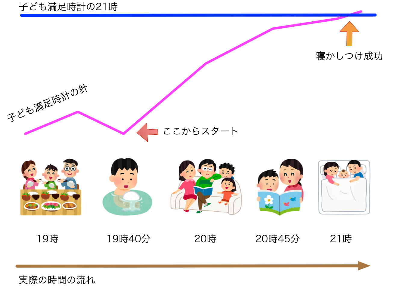 寝かしつけたい時間から逆算して、子どもの満足時計をどうやって進めるかを一度考えてみてください。