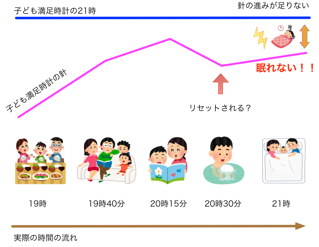 食事から家族団らん、絵本の時間と徐々に満足度が上がっていって、そろそろ満たされるかなと思ったところで、お風呂に入ることでリセットされてしまってお布団に入ってもなかなか眠れない状態に…