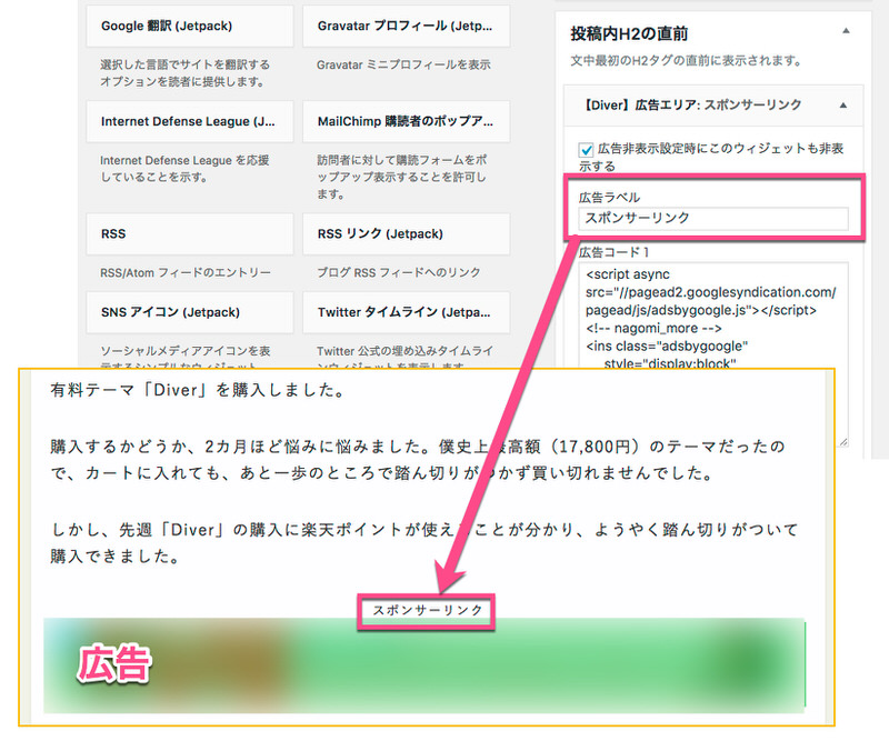 たとえば、アドセンスの場合、広告の上部に「スポンサーリンク」を入力して、広告の視認性を高めるべきと言われています。そういったデザインも専用のウィジェットを使用すると誰でも簡単にできます。