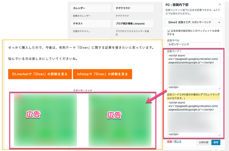 「広告のエリアは用意しておくけど、後は自分で装飾してね」というテーマがほとんどです。しかし、Diverは広告エリアの機能がしっかりしているので、ウィジェット画面から設定するだけでOKなのは本当に助かりました。