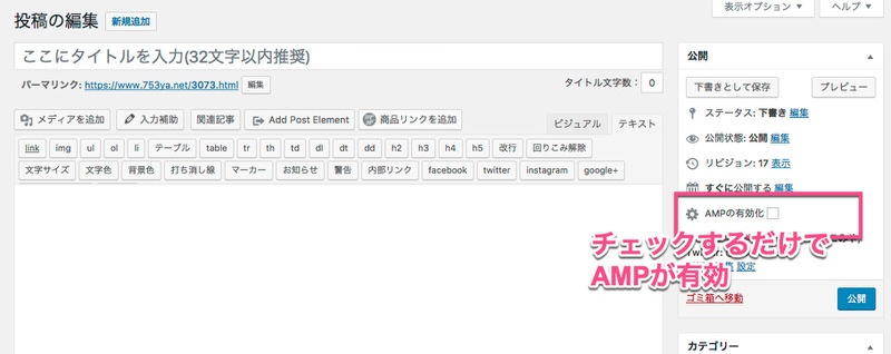 2017年になって話題のAMP対応もチェック一つで記事単位に設定が可能です。