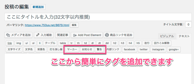 他には文字のマーカーとか、警告やお知らせ表示なんかも専用のボタンがあるので簡単に入力できますよ。