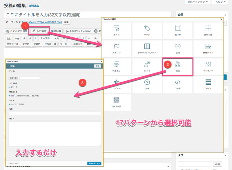 「Diver」は、テーマのカスタマイズに時間をかけたくないという方と相性が抜群です。とにかく投稿画面の入力補助機能が充実しています。文字の装飾や体裁が専用画面から簡単に入力できるので、テーマをカスタマイズする必要がありません。