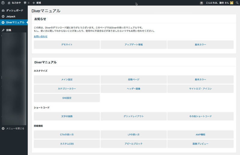 WordPressテーマの中ではマニュアルがしっかりできているテーマです。管理画面からマニュアルページに遷移できます。