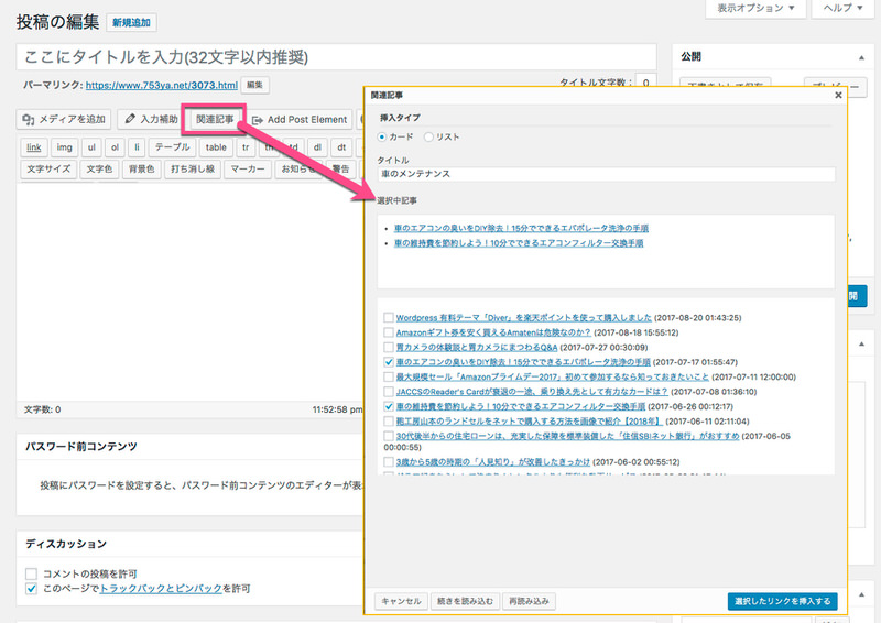 関連記事の挿入も簡単です。専用ボタンを押すと、カード形式、リスト形式から選択して、記事を一覧から選ぶだけです。
