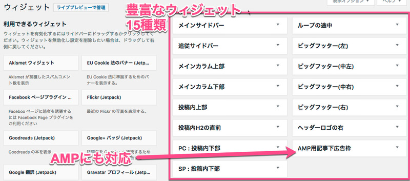 標準で用意されているウィジェットは15個もあります。一般的に広告の貼り方は網羅されていると思います。AMP対応の広告枠もあり、時代の流れに乗ってくれているところも嬉しいですね。